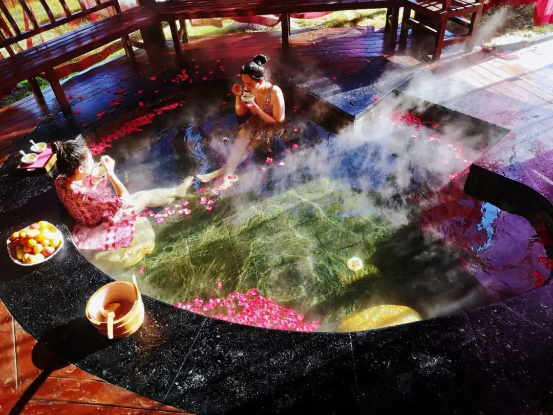 溫泉區(qū)域?qū)榕客瞥雒倒逑泱w湯、牛奶浴、紅酒浴,